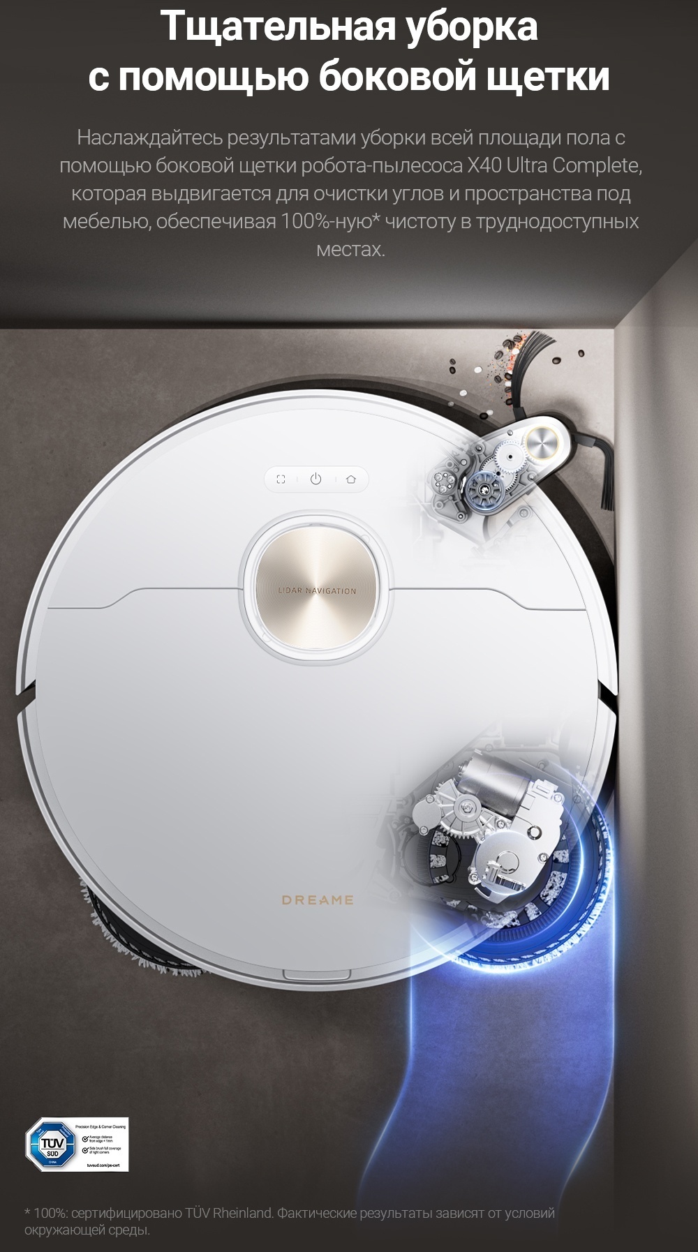 X40 Ultra удаляет загрязнения под низкой мебелью и глубоко в углах